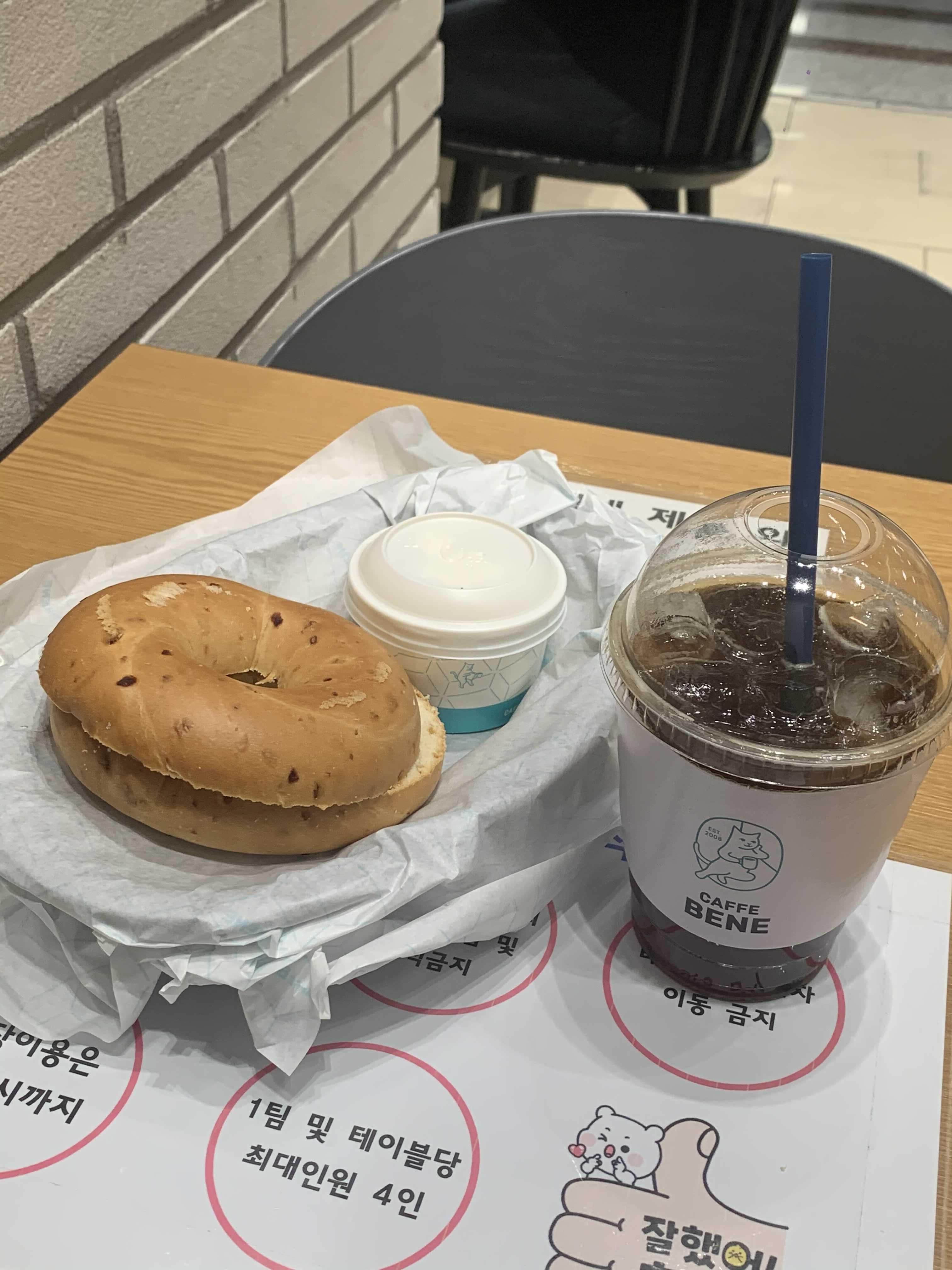 공항 내에 따로 식당 같은 음식점이 없었기에 중학교 때 추억이 가득한 카페베네에서 아아 한잔과 크림치즈 베이글로 대체하였다.